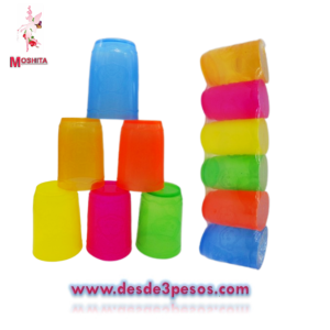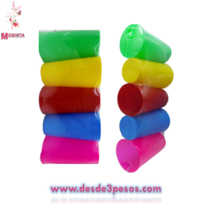 Paquete con 5 vasos 14 alto 8 cm. Diametro en plastico de colores. Costo Pza $ 7.50