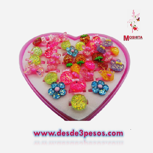 Estuche en forma de corazon con 36 anillos en diferentes figuras brillosas para niñas 15 x 15cm.